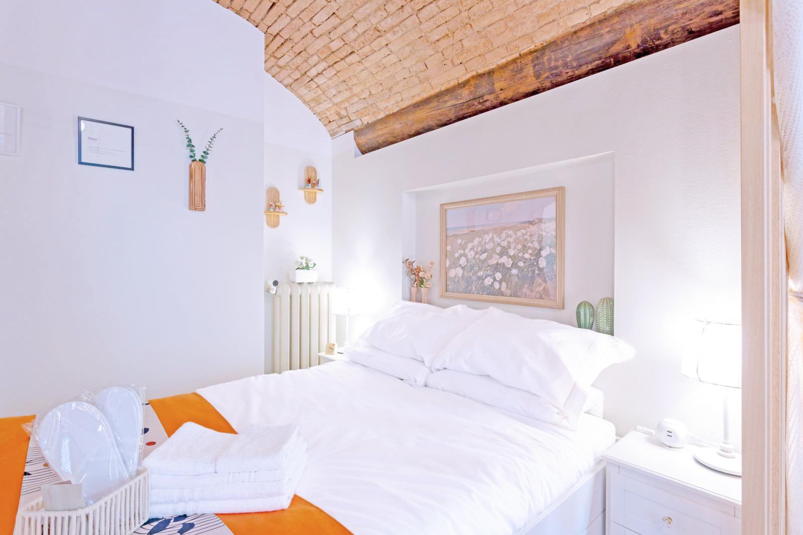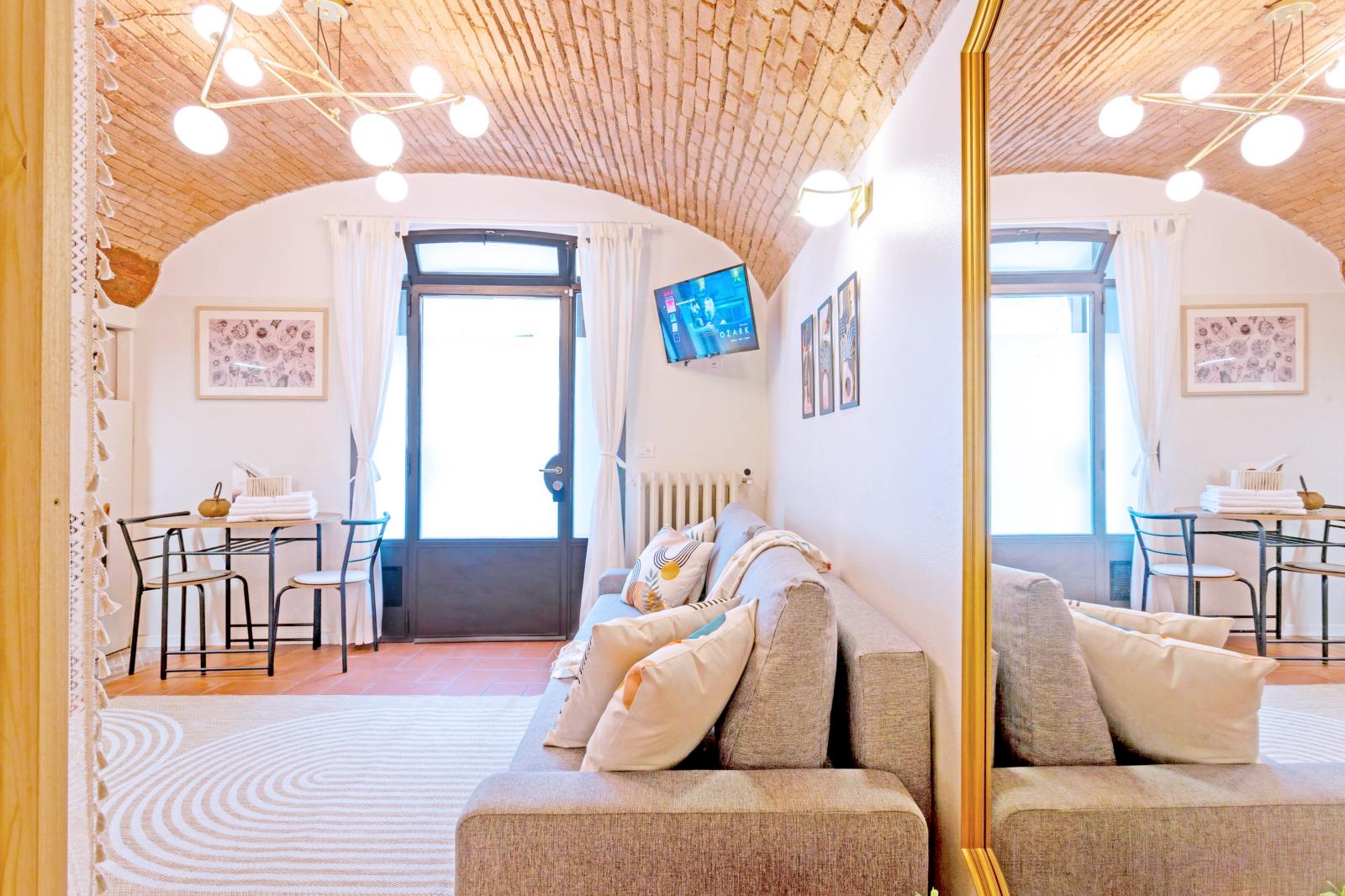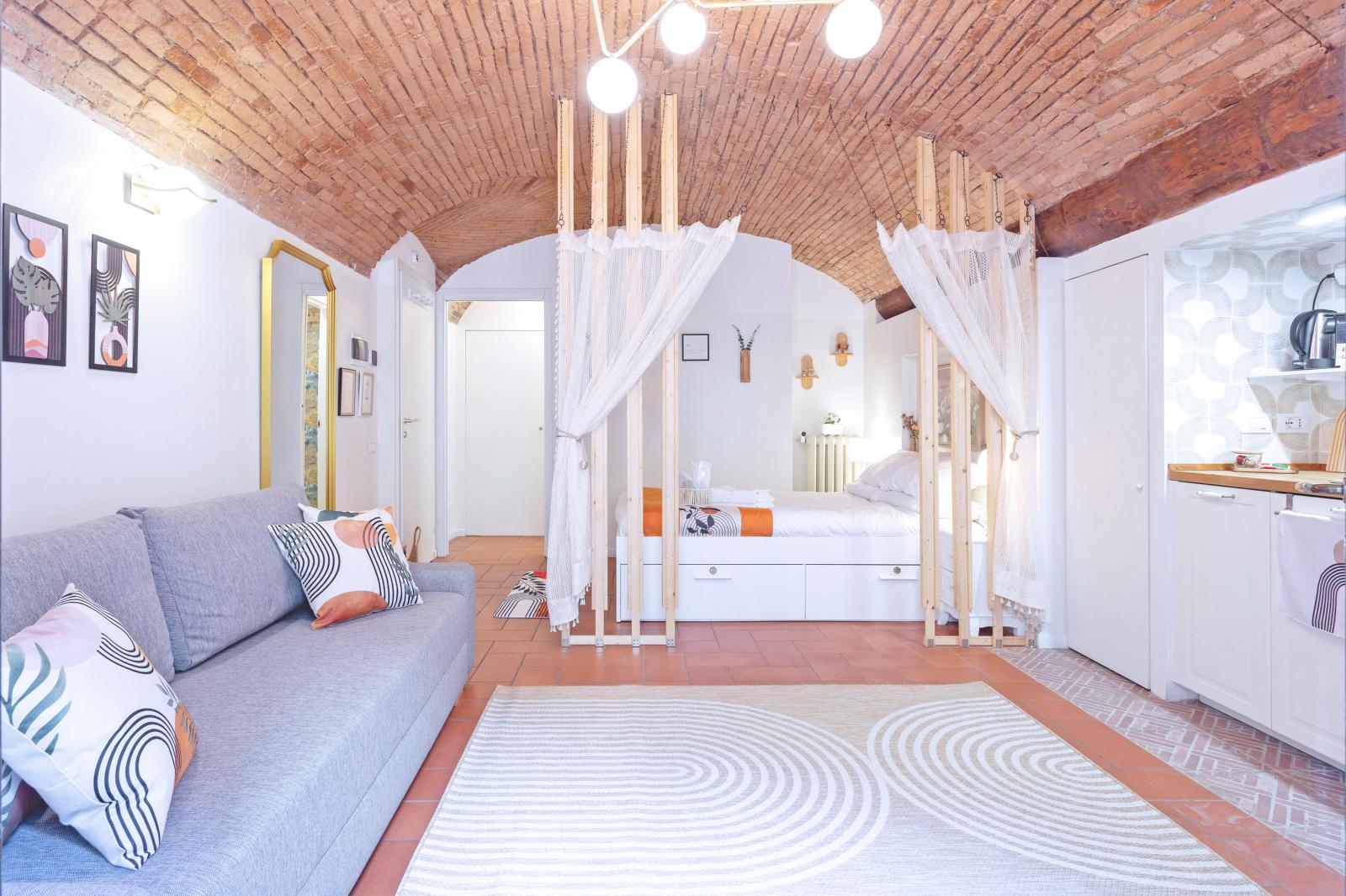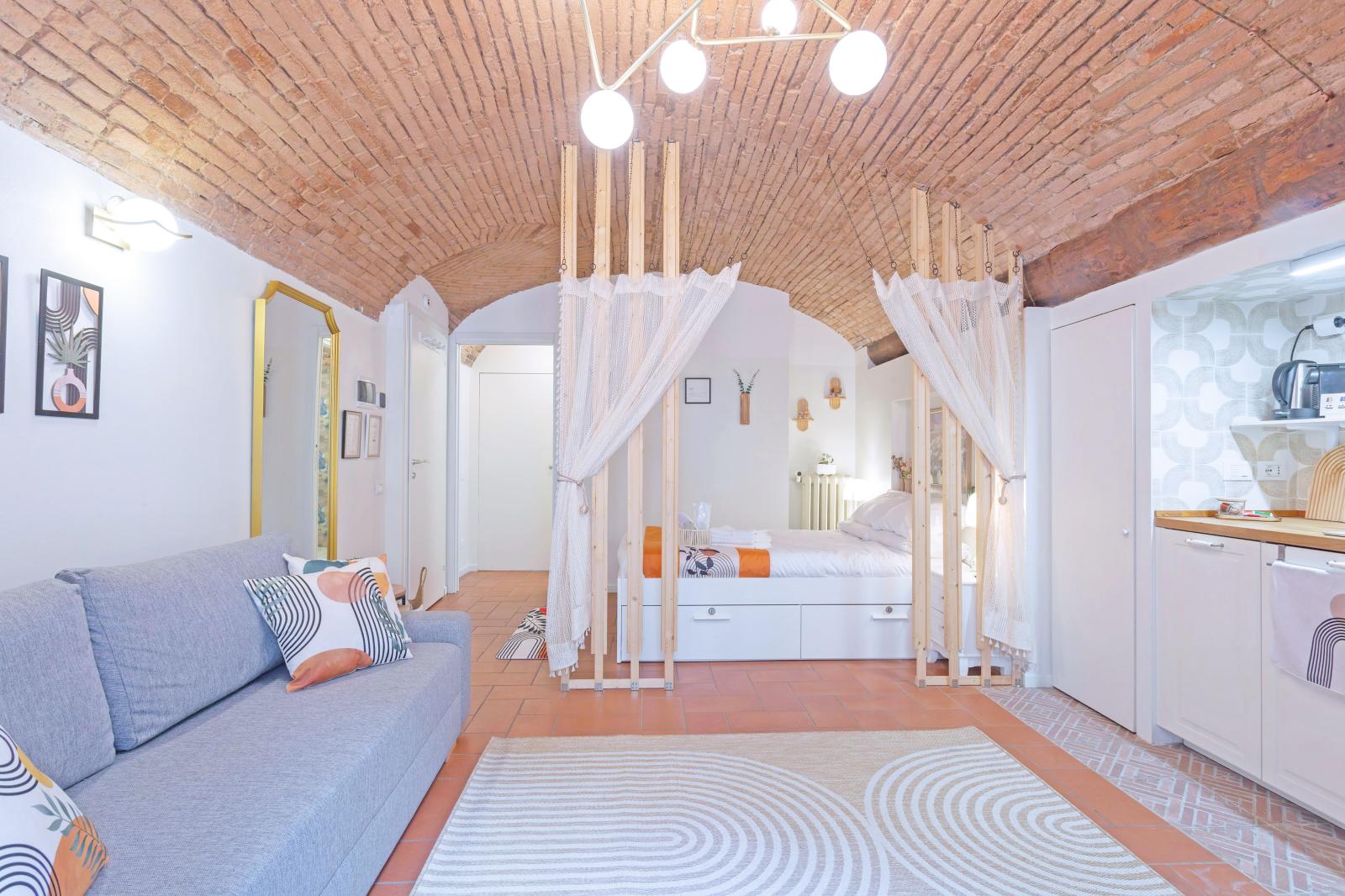 The brick-arched ceiling of Appartamento Arco creates a cozy, artistic & Authentic atmosphere. Designed for comfort and relaxation, it features a double bed and a convertible sofa for up to two extra guests.
