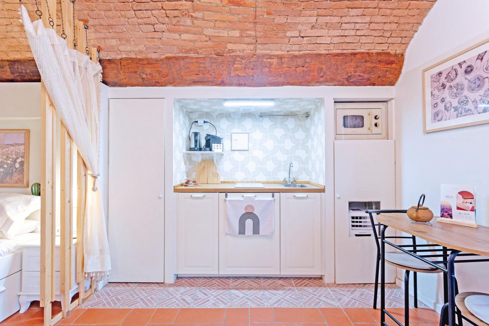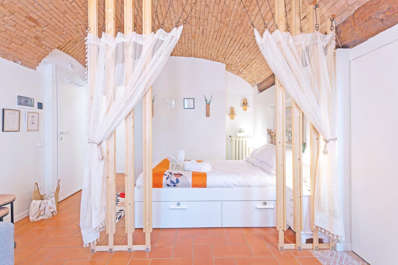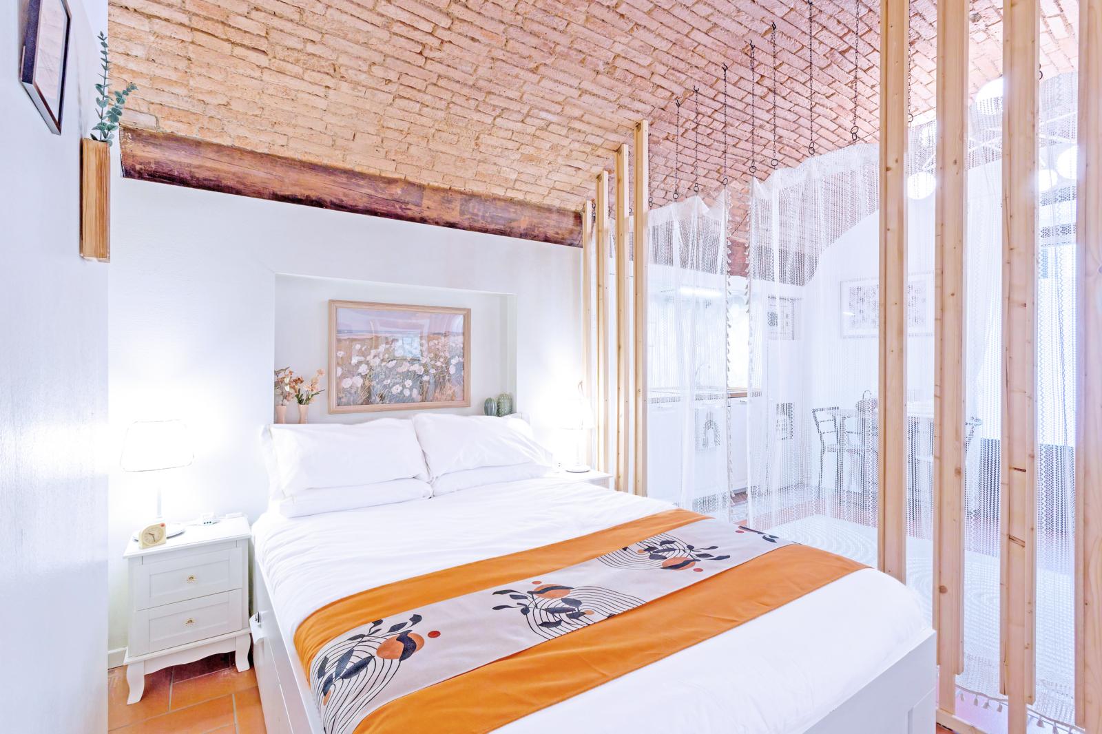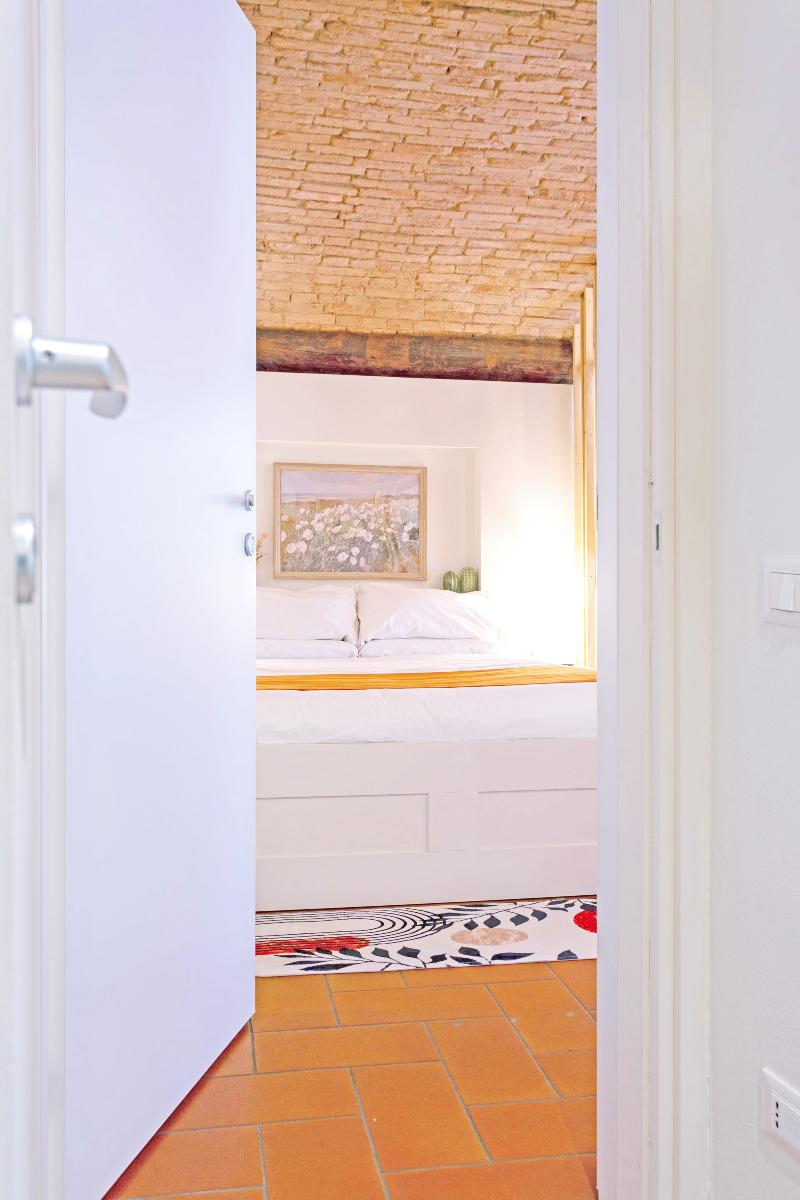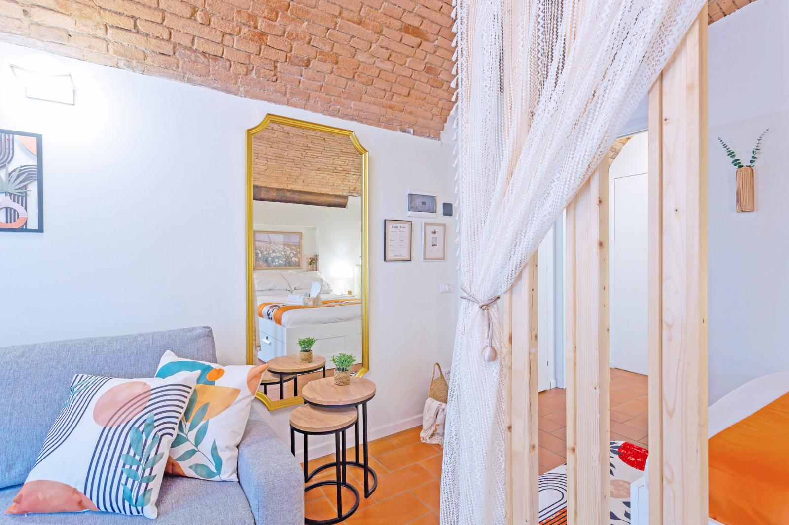 The brick-arched ceiling of Appartamento Arco creates a cozy, artistic & Authentic atmosphere. Designed for comfort and relaxation, it features a double bed and a convertible sofa for up to two extra guests.